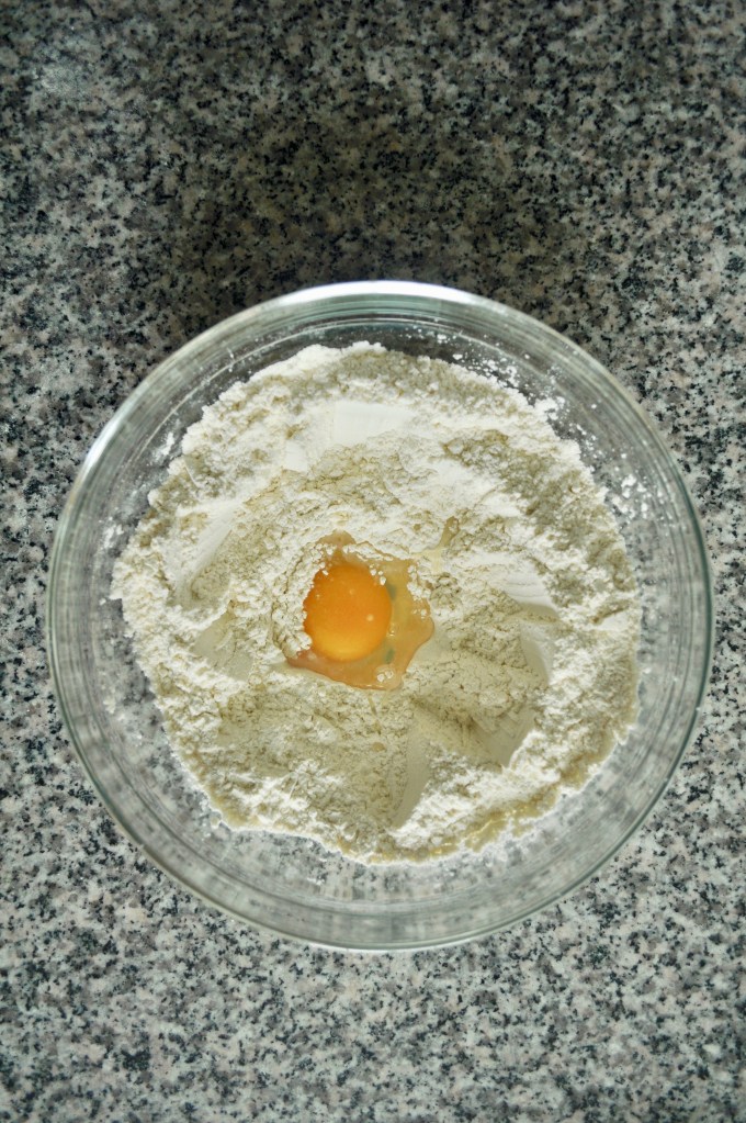 - Meanwhile, make the dough. Mix flour and salt, then mix in egg until the dough is clumpy.