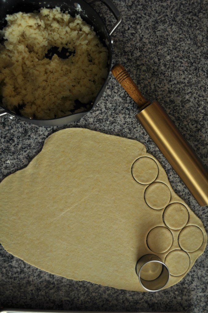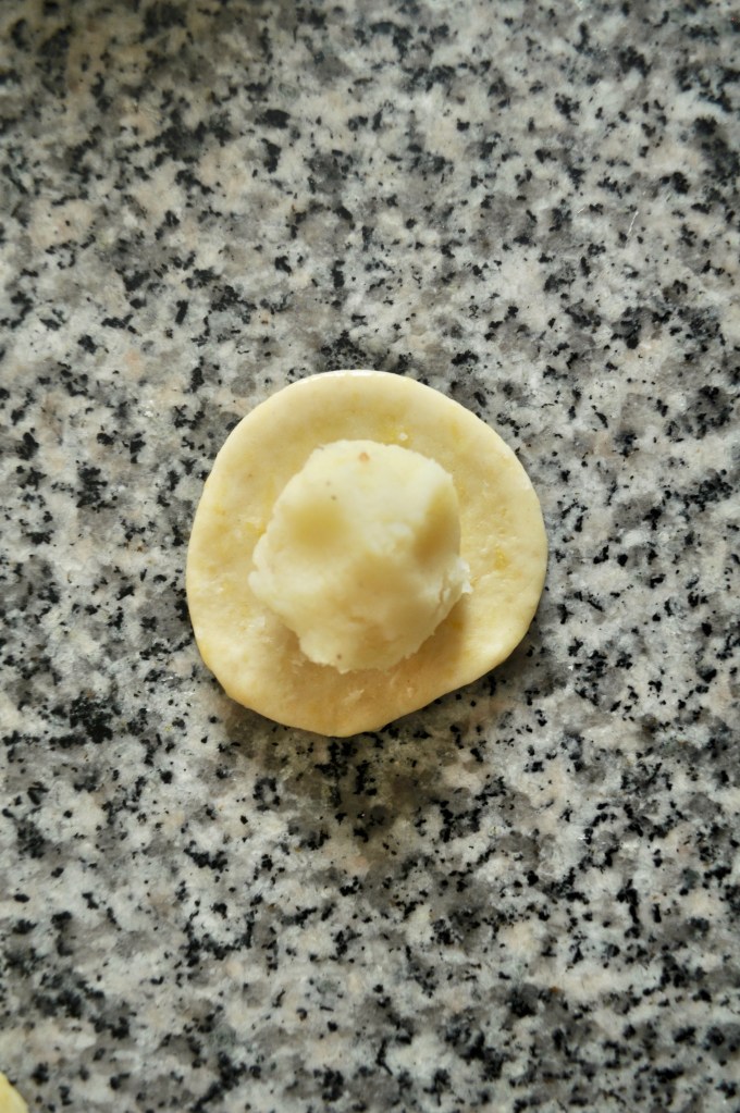 Place a teaspoon of filling on each round of dough, then, using your finger, rub a small amount of water on half of the edge of the dough (this will help create a seal)