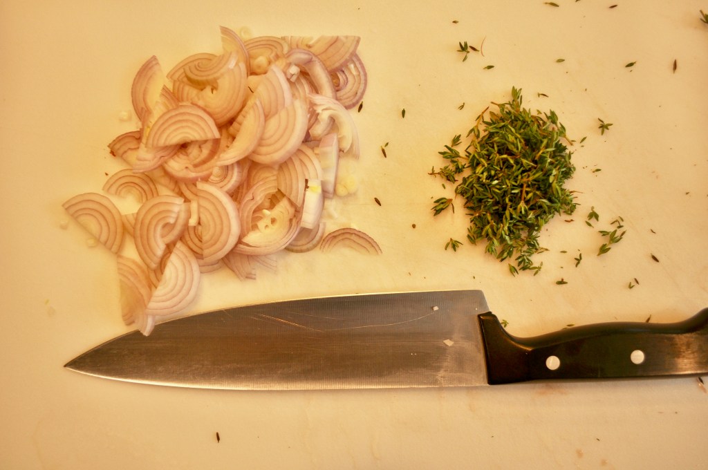 - Peel, halve and thinly slice shallots, strip thyme from stems