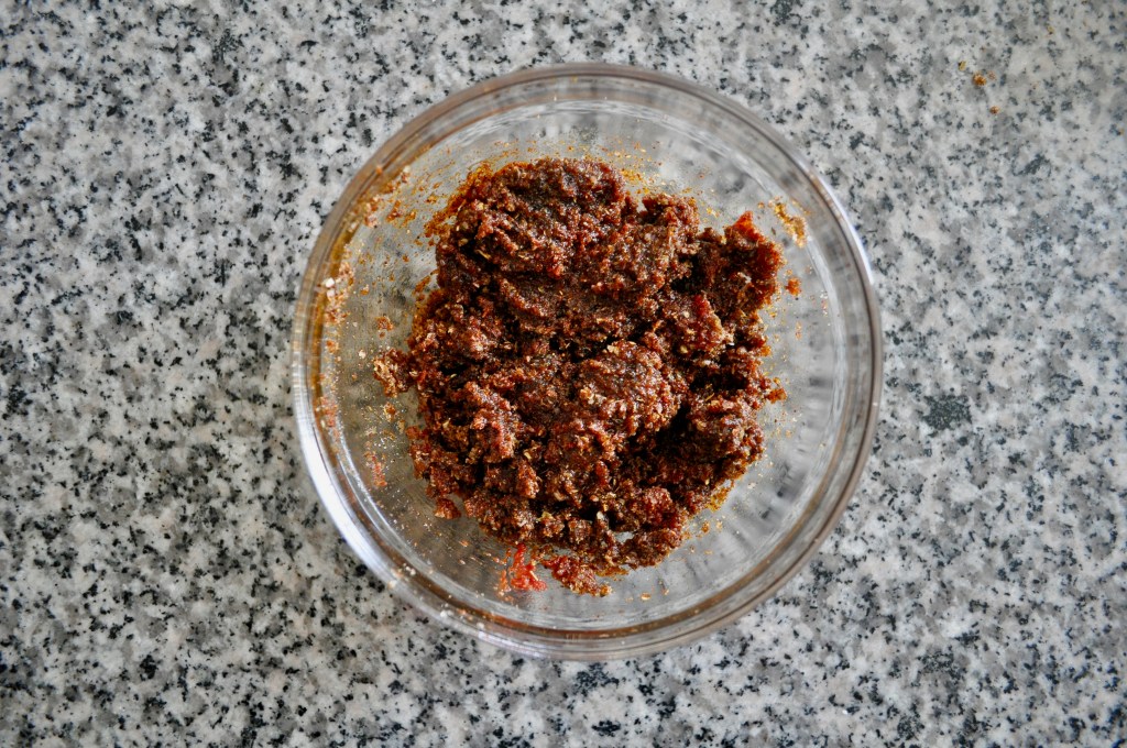 Combine the spices, brown sugar, olive oil and tomato paste in a bowl.