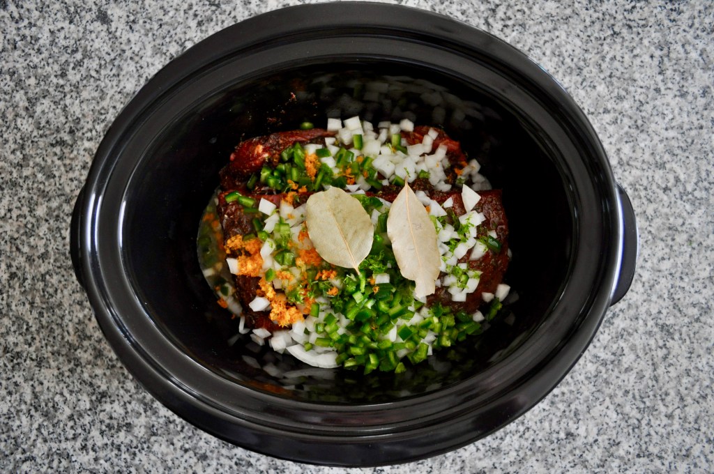 Add the brisket to a crock pot, top with the chopped onion and jalapeno, lime and orange zest, and bay leaves. Add the lime and orange juices and liquid smoke. Cover and cook on high for 4-6 hours, or low for 6-8 hours, or until the brisket is cooked through and shreds easily. I recommend cooking on low.
