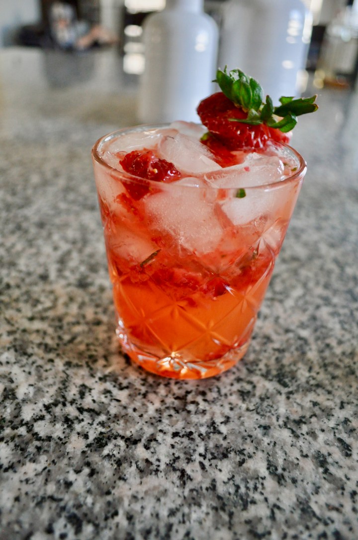Fresh strawberries and mint, rum, lemonade, elderflower liquor (St. Germain) and ginger beer.