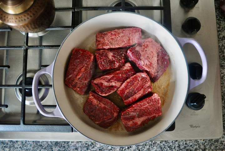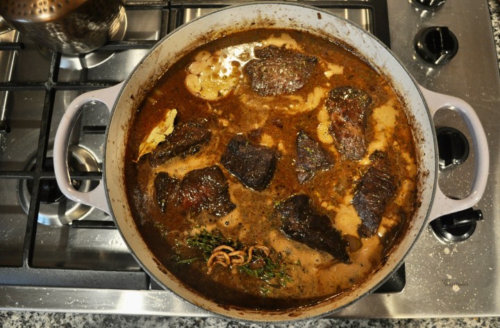 Add the beef stock and stir to combine. Cover the pot and put in the oven. Cook for about 2.5-3 hours, or until the short ribs are tender and easily fall apart.