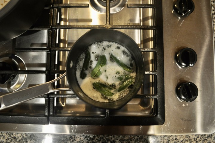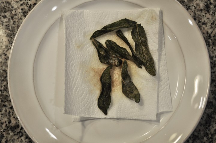 Add the sage leaves and cook until beginning to crisp, about 2-3 minutes, then remove and place on a towel lined plate.