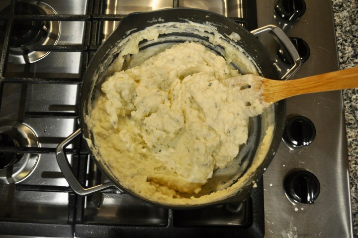 Remove the garlic and herbs from the sauce and skim any fat from the top. To amp up the garlic flavor in the mashed potatoes, which I highly recommend, squeeze a few of the garlic cloves from the head of garlic and mix them into the potatoes. They will be very soft and should mix into the potatoes smoothly.