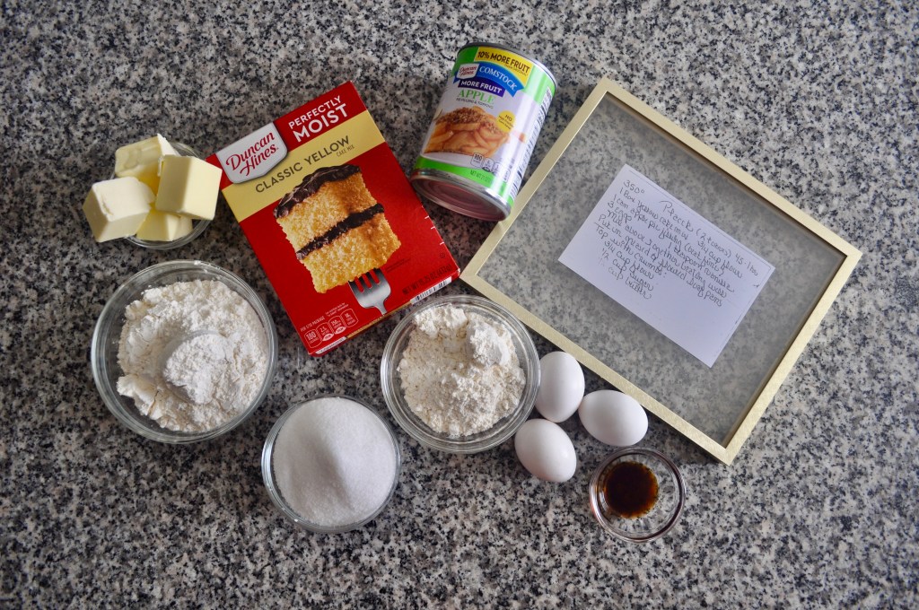 You don’t need much to make this delicious bread – just cake mix, canned apple pie filling, eggs, vanilla, butter, sugar and flour.