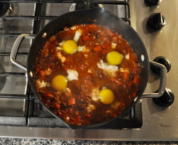- Crack the eggs in the pockets, then cover and continue simmering until the eggs are cooked through and poached, about 5-10 minutes more.
