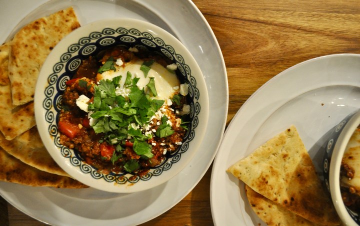 - Carefully divide the meat mixture and eggs between four bowls, taking care to keep the eggs intact. Top with fresh cilantro and feta cheese, and serve with naan.